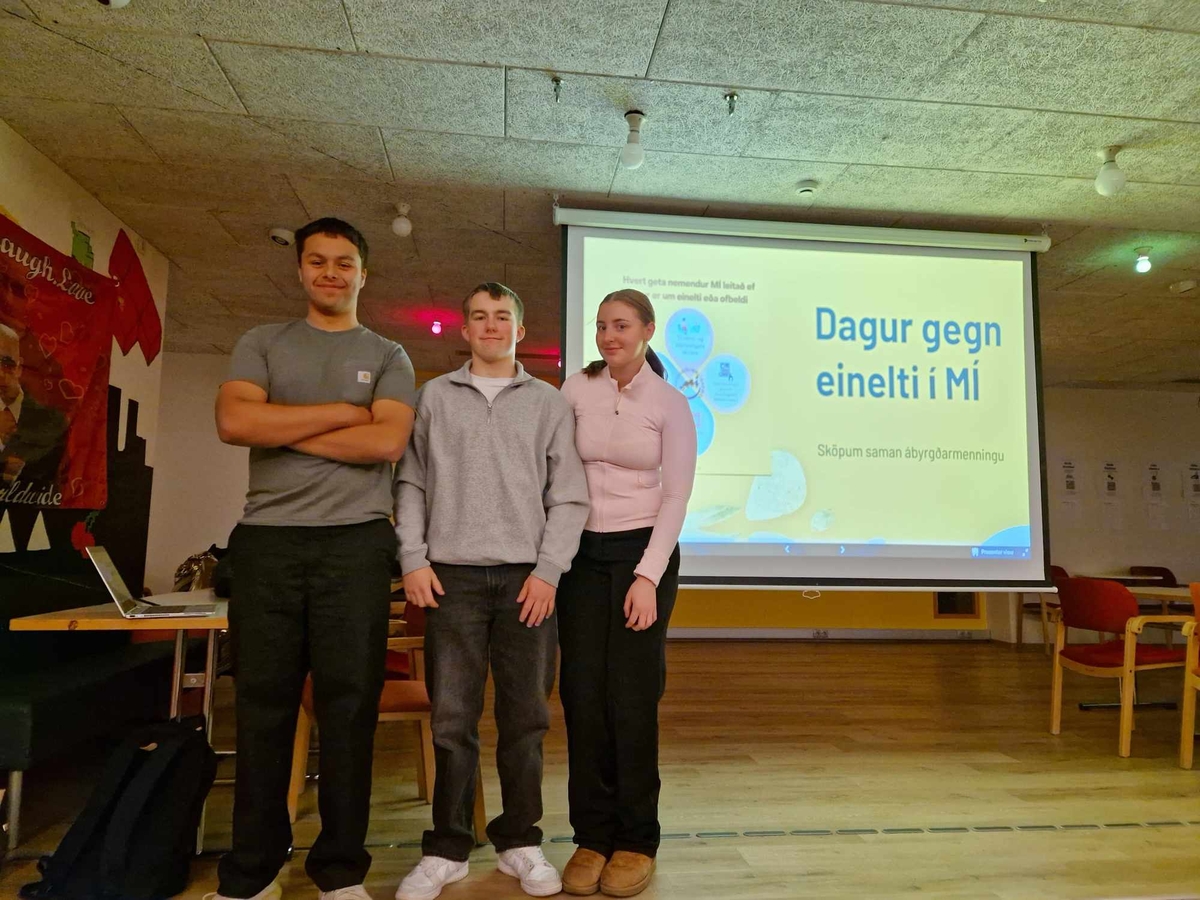 Áttundi nóvember er ár hvert helgaður baráttunni gegn einelti. Í tilefni þess héldu þrír nemendur, þau Jón Gunnar, Kristján Hrafn og Sæunn Lív, kynningu fyrir nemendur um hvað ofbeldi og einelti er og hversu víðtækar og alvarlegar afleiðingar það getur haft. Í kynningu sinni komu þau inn á sameiginlega ábyrgð allra í skólanum á því að skapa góða skólamenningu þar sem pláss er fyrir alla og hvöttu samnemendur til að þess að tilkynna allt ofbeldi og einelti sem þau verða vör við. Það má t.d. gera í gegnum ábendingahnapp á heimasíðunni www.misa.is. Í gæðahandbók skólans er að finna upplýsingar um stefnu skólans, aðgerðir og viðbrögð við einelti og ofbeldi, sjá hér.