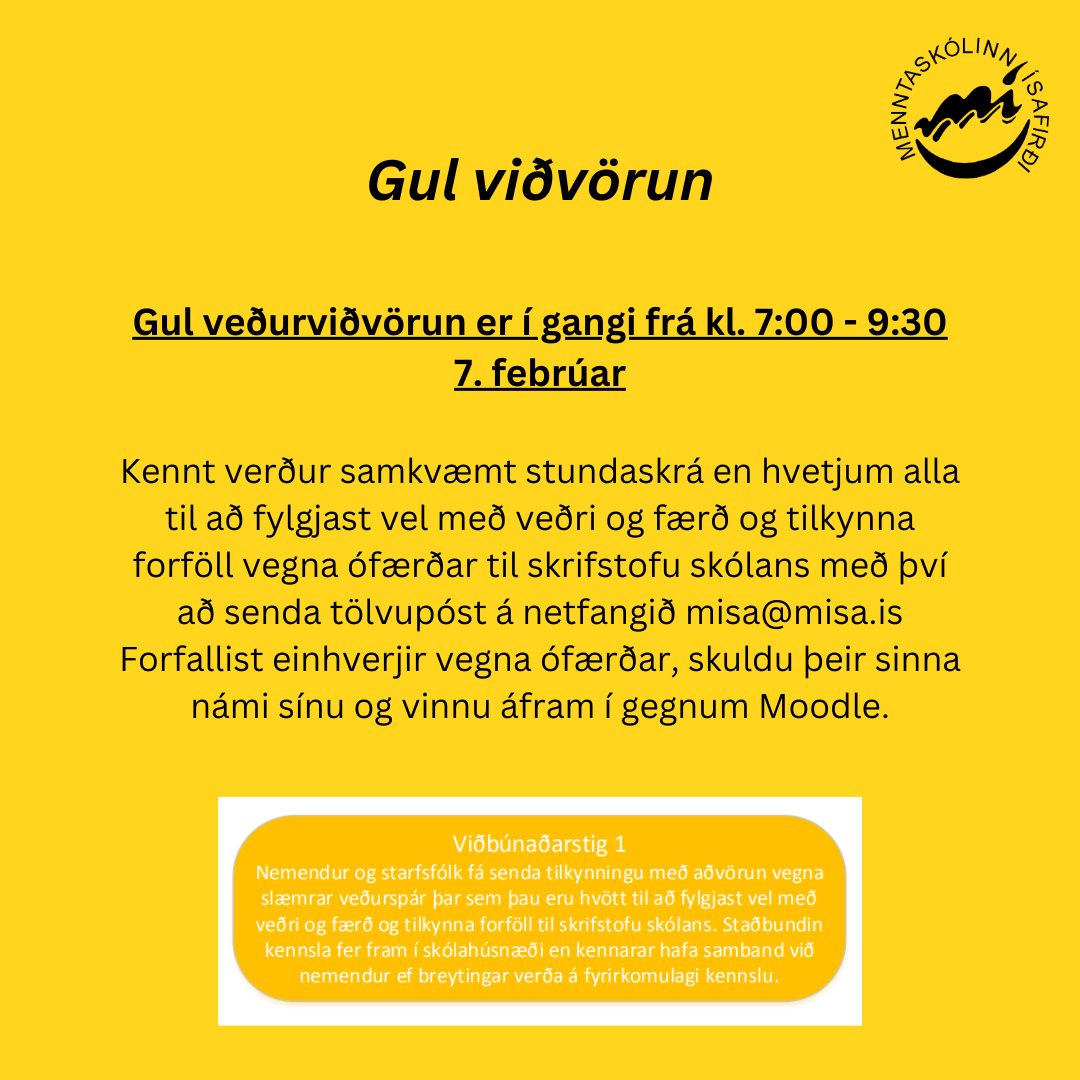 Gul viðvörun er í gangi þriðjudaginn 7. febrúar frá 7:00 - 9:30.