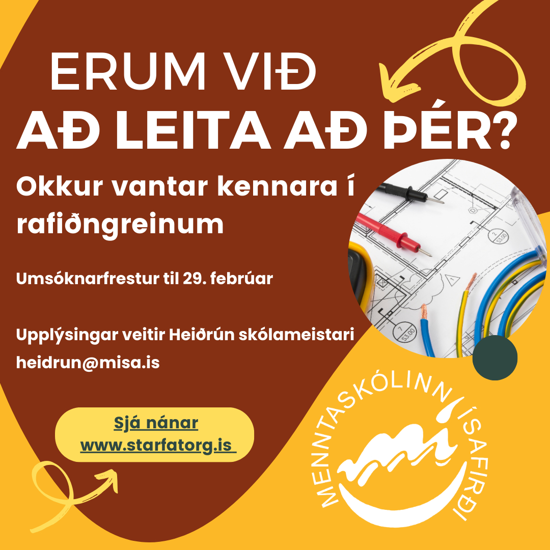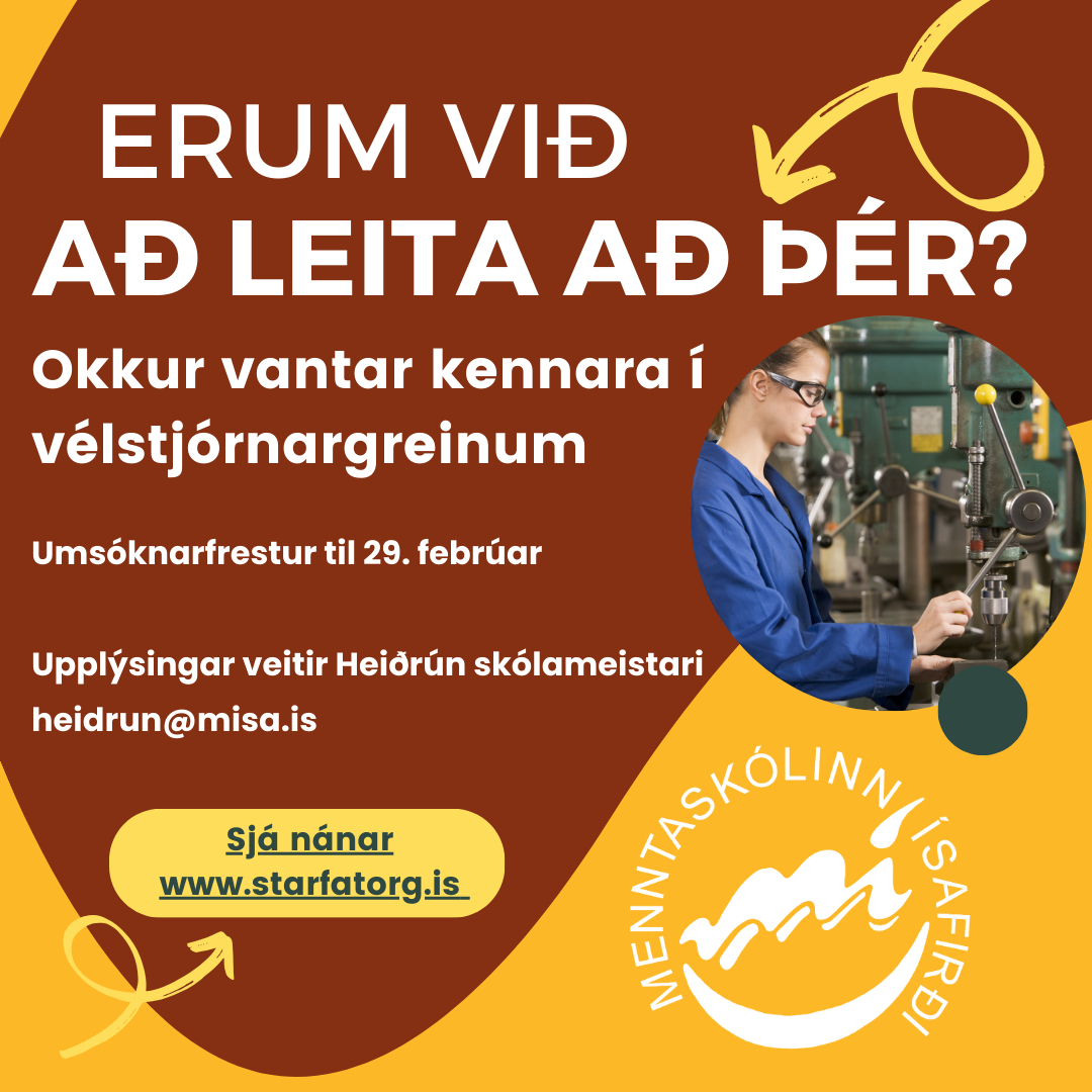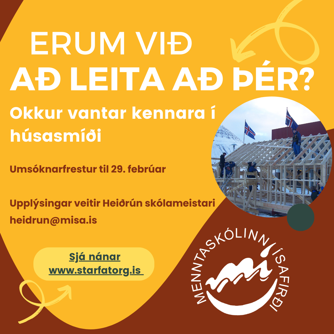 Menntaskólinn á Ísafirði auglýsir þrjár lausar stöður í kennslu. Um er að ræða kennslu í húsasmíði, kennslu í rafiðngreinum og kennslu í vélstjórnargreinum á A- og B-stigi. Leitað er að einstaklingum sem hafa áhuga á fjölbreyttri kennslu í stað- og dreifnámi, eru færir í samskiptum og falla vel að aðstæðum og þörfum skólans.