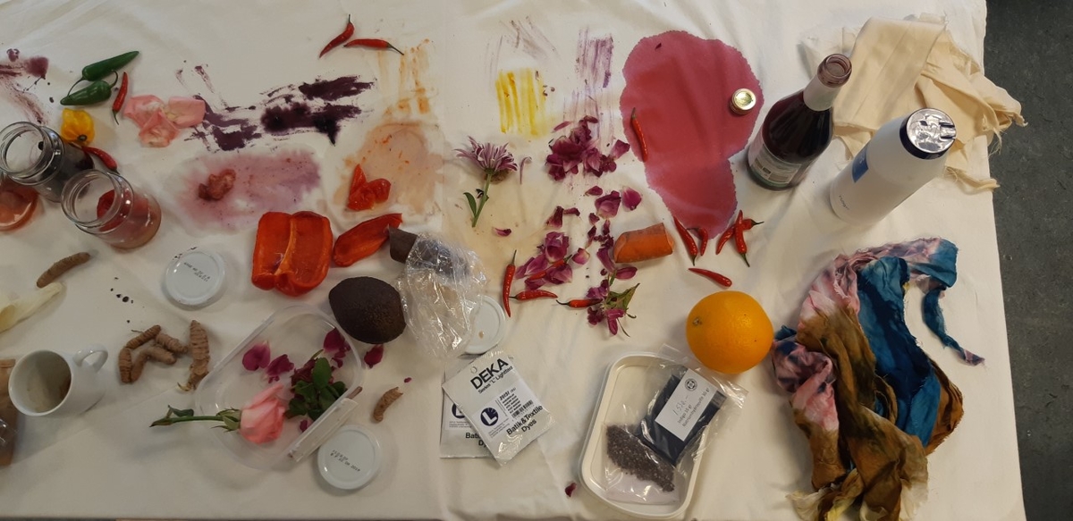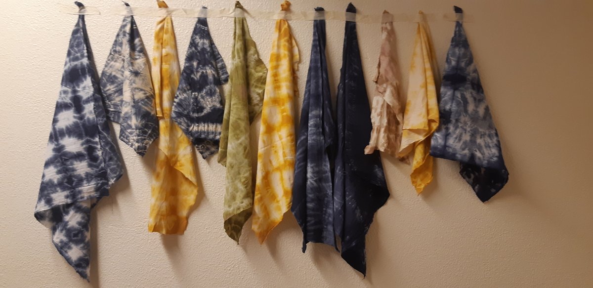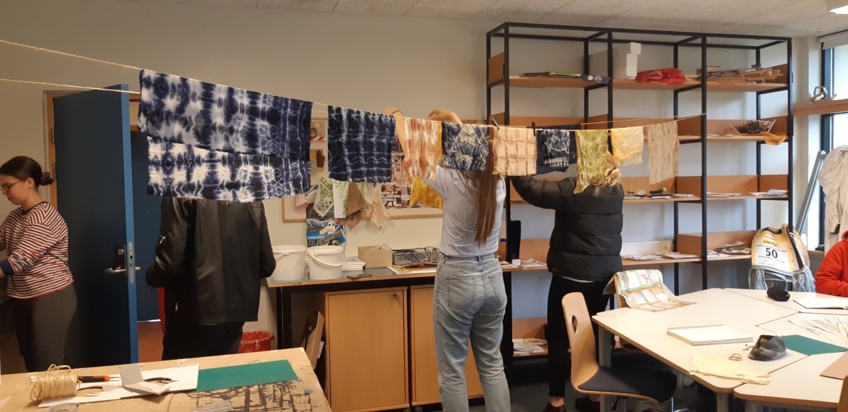 Þessa dagana eru nemendur í áfanganum Textílvinna, hönnun og sköpun að vinna með náttúrulega liti. Meðal annars prófa nemendur sig áfram með ávexti, ber og blóm og ýmis matvæli. Þannig kynnast nemendur möguleikum á að minnka matarsóun. Einnig er unnið með japanska litunartækni sem heitir Shiboro og í henni felst sérstök munsturtækni. Eins og sjá má á meðfylgjandi myndum er litagleðin alls ráðandi og í harðri samkeppni við haustlitina sem núna setja svip sitt á Skutulsfjörðinn.