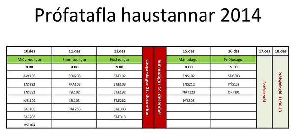 Prófatafla fyrir námsmatsdaga í desember hefur verið samþykkt af skólaráði er birt í INNU. Nemendur geta þar með séð í INNU hvenær þeir eiga að mæta í þau próf sem þeir eru skráðir í. Athugið að prófin hefjast alltaf kl. 9 og standa í eina og hálfa klukkustund. Upplýsingar um staðsetningu próf í stofum verða hengdar upp á auglýsingatöflum í bóknámshúsi fyrir hvern prófadag.