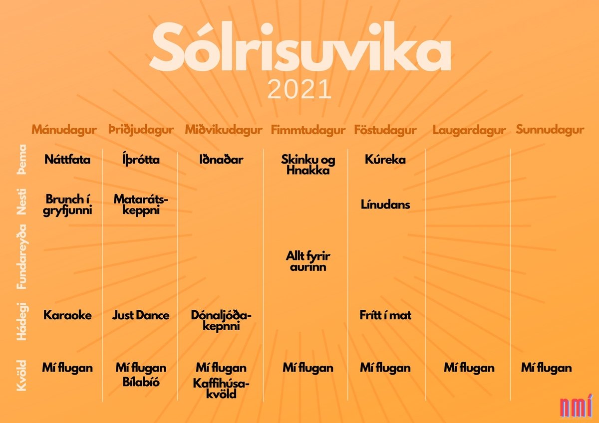 Sólrisuhátíð 2021 var sett sl. föstudag með stuttri skrúðgöngu og síðan var boðið upp á möffins í Gryfjunni. Framundan er sólrisuvikan og þar sem talsvert hefur verið létt á samkomutakmörkunum með nýrri reglugerð um skólahald sem tók gildi í síðustu viku, þá verður hægt að bjóða upp á skemmtilega dagskrá alla vikuna. Gróskudagar verða svo á sínum stað á þriðjudag og miðvikudag þar sem gert er uppbrot á hefðbundinni kennslu og nemendur geta valið sér smiður af ýmsu tagi.