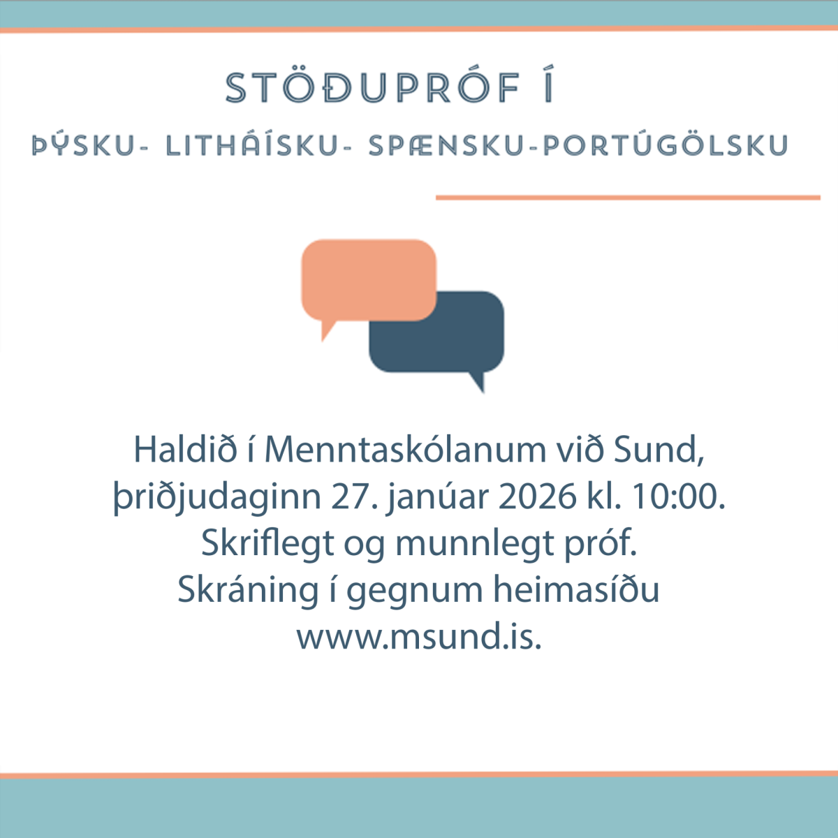Stöðupróf í þýsku, litháísku, spænsku og portúgölsku verða haldin í Menntaskólanum í Sund þriðjudaginn 27. janúar 2026 kl. 10.